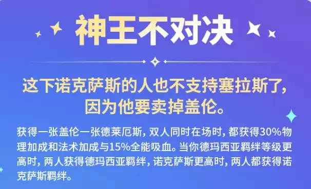 再看看强化符文。“神王不对决”这个符文同时关联了盖伦和德莱厄斯,当两人同时登场时,他们会获得30%的物理与法术加成,以及15%的全能吸血。不仅如此,系统还会自动判定两人中德玛西亚或诺克萨斯羁绊等级更高的一方,并为两人同时激活该羁绊效果。这种让两个“宿敌”核心共存并相互加强的设计比较少见,玩法的核心思路就在于判断当前环境下,德玛西亚和诺克萨斯哪个羁绊更容易成型,然后顺势围绕其构建阵容。