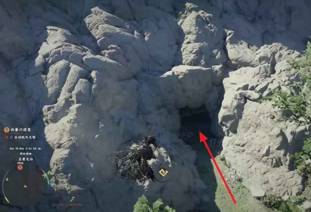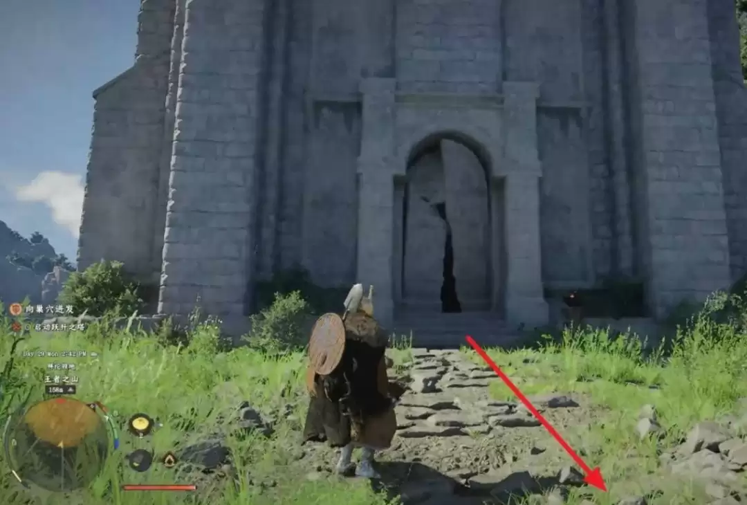 如何找到正确入口呢?请面向塔的正门,然后转身观察右后方区域。没错,真正的入口位于右下方,那里隐藏着一个不起眼的洞口,这才是探索塔楼的起始点。