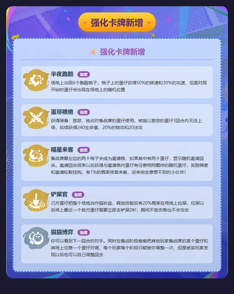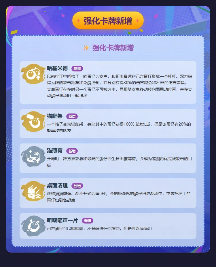 各位蛋仔岛的棋手们,新一回合的博弈即将开始。4月2日,蛋仔碰碰棋将率先迎来一波关键性平衡调整,涵盖蛋仔、羁绊与装备强度;紧接着在4月3日,备受期待的“喵星”主题卡牌包将正式登场,更有特殊的开局玩法等待各位探索。新一轮的碰碰棋对局,已经准备就绪。