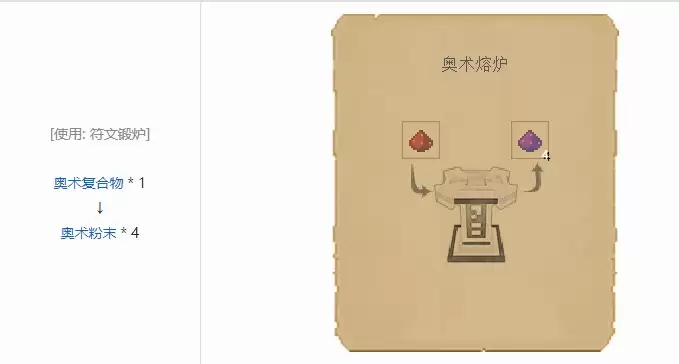 下面这张合成表,可以说是一目了然。准备好对应的材料,按照这个图示摆进工作台,你就能稳稳当当地拿到奥术粉末了。话说回来,记得检查一下材料是否齐全,这一步可马虎不得。