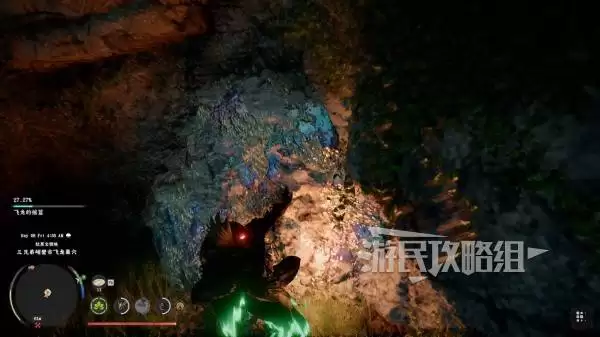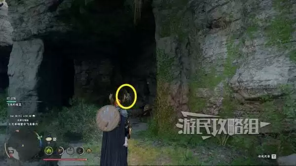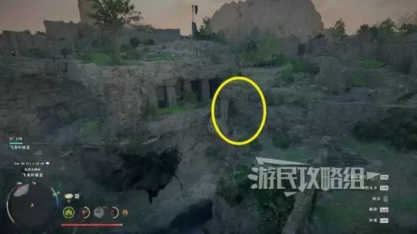 这里有个实用技巧:建议你先爬上附近的“飞龙的摇篮”据点瞭望塔,然后滑翔下去寻找。目标是一个下层布满巨大石柱的区域。到达后,从右侧的石柱间进入一条通道,走到尽头会看到一堆可破坏的石头。