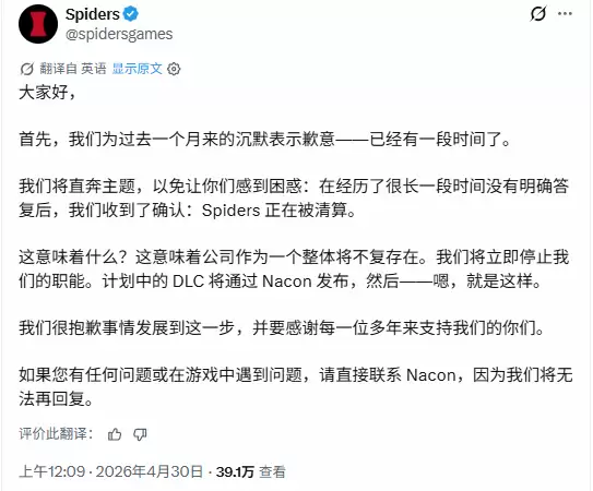 声明中的语气直接而无奈:“我们就直说了:经过漫长等待,我们确认Spiders将被清算。这意味着公司将彻底消失。我们会立即停止工作,DLC发布后,一切也就结束了。” 字里行间,透露出一种尘埃落定后的疲惫。