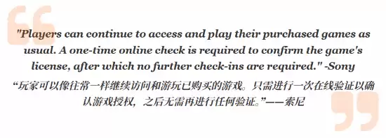 根据索尼的解释,玩家们大可放心,已经购买的游戏依然可以正常访问和游玩。所谓的验证,其实只需要进行一次联网授权确认即可,并非需要周期性重复操作。