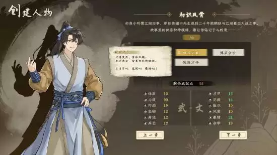 游戏开场提供了精细的角色出身与偏好设定,其自由度让人联想到《骑马与砍杀》系列。你可以效率至上,“捏”出一个武学天赋卓绝的少年天才;也可以随心所欲,塑造一位精于杂学、颇具风骨的江湖才子。选择权,完全在你手中。