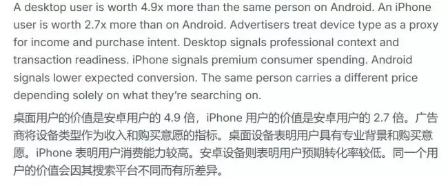 究竟是哪些因素在主导这场“定价游戏”?报告指出,设备、年龄、育儿状态以及地理位置是四大核心决定因素。数据不会说谎:桌面端用户的价值是安卓用户的4.9倍,而iPhone用户的价值也是安卓用户的2.7倍。设备类型,首先就划下了一道清晰的价值分界线。