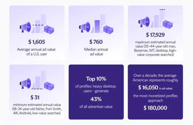 那么,这个价格是如何被定出来的?研究发现,(G-G)的定价模型极为精细,它将用户的搜索习惯、使用的设备类型以及所处的地理位置统统纳入了考量。虽然1605美元是平均值,但个体之间的差异堪称天壤之别。价值最高的用户,年度广告估值可达17929.3美元,而最低的仅为31.05美元,两者相差足足577倍。这背后的商业逻辑,值得细细品味。