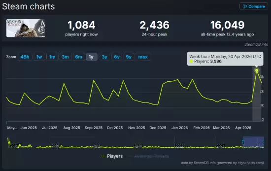 这不,《刺客信条4:黑旗》近期在Steam平台上的在线人数,就创下了两年多来的新高。数据显示,当前在线人数大约在2149人,而本月峰值更是超过了3500人。这股回坑潮,势头相当明显。