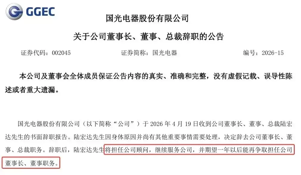 两份公告均宣布,董事会收到公司董事长、董事陆宏达的书面辞职报告。辞职理由表述一致:因身体原因并尚有其他重要事情需要处理。陆宏达决定辞去公司董事长、董事职务(在国光电器还同时辞任总裁职务)。公告同时留下了一个意味深长的“尾巴”:辞职后,陆宏达将担任公司顾问,继续服务公司,并期望后续能再争取担任公司董事长、董事职务。