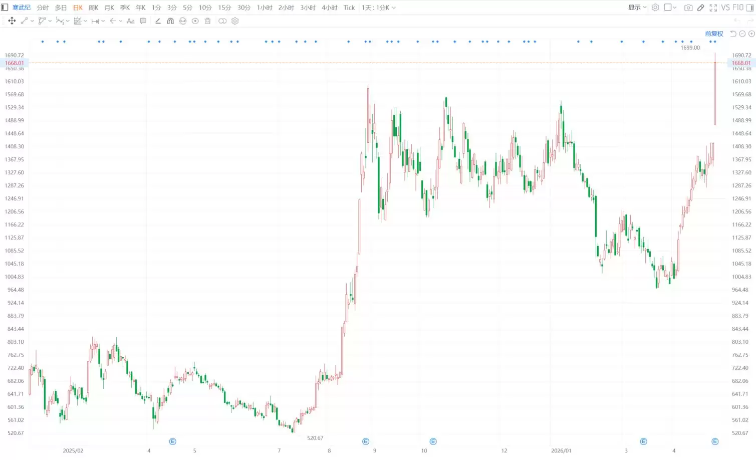 格隆汇4月30日|算力芯片龙头寒武纪盘中扩大涨幅至超9%,一度报1549 99元,股价反超源杰科技,重夺股王宝座。 市场总是充满戏剧性。就在今天,算力芯片领域的领头羊寒武纪,盘中上演了一出精彩的“王者归来”。其股价涨幅一路扩大至超过9%,最高触及1549 99元。这一关键性的跃升,直接使其股价实现了