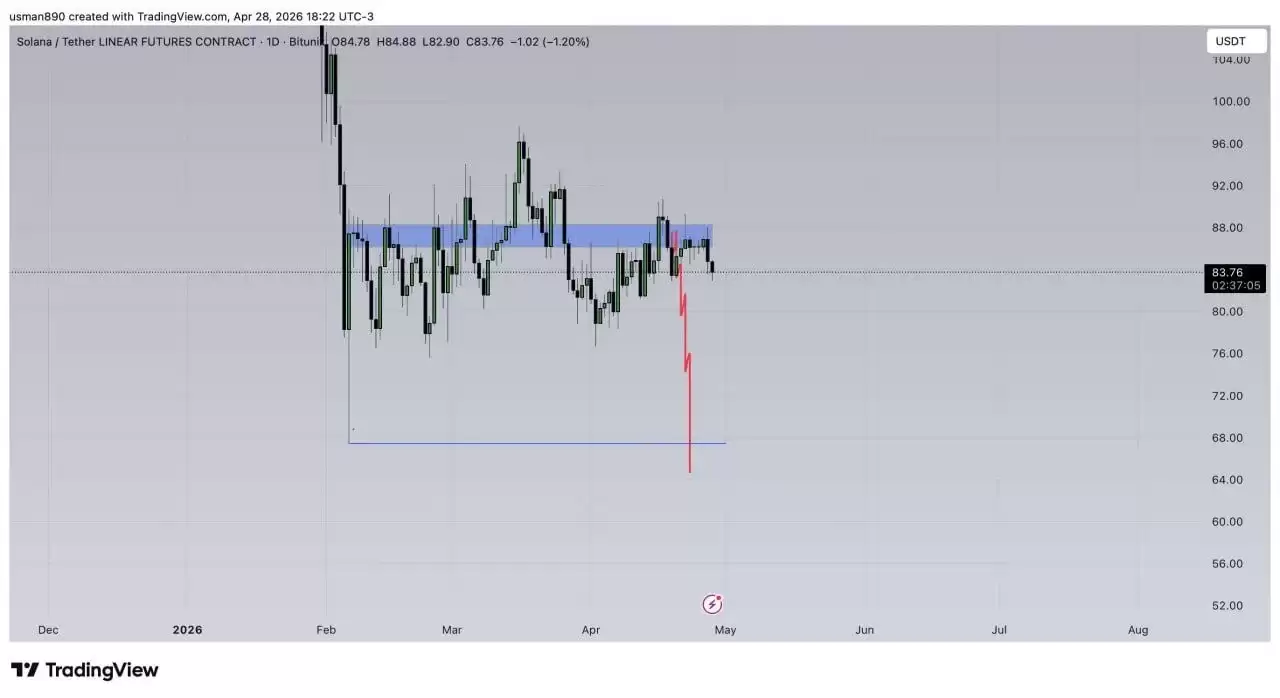 仔细观察图表,你会发现SOL在下跌之前,其实已经在上方趋势线附近屡次受阻。随后,价格便快速击穿了形态下轨,并在84美元一带继续走弱。这一系列动作相当明确地传递出一个信号:在多次尝试推高价格未果之后,买家已经暂时失去了短期的控制权。