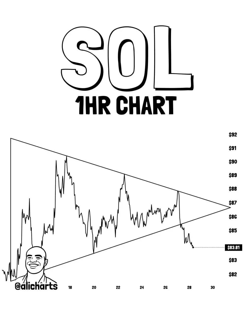 从Ali Charts分享的图表可以清晰看到,SOL在失守三角形内部的支撑后,价格已经滑落至83.81美元附近。这个形态其实在4月下旬就开始酝酿了,当时价格在不断地走出更低的高点和更高的低点,形成一个典型的收敛结构。可惜,最近的这波走势直接把价格压到了下方趋势线之下,让这个形态的支撑意义大打折扣。