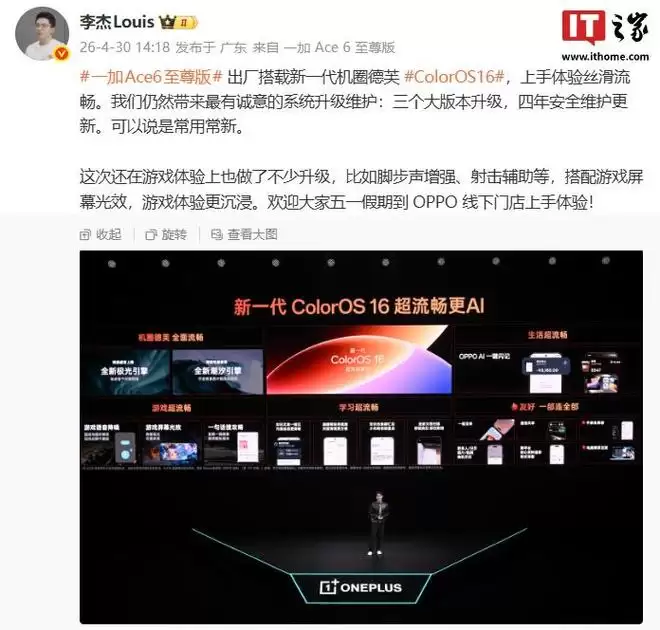 一加 Ace 6 至尊版确认搭载 ColorOS 16,系统更新政策延续 4月28日晚,一加 Ace 6 至尊版正式亮相。这款新机搭载了天玑 9500 处理器,并且有一个吸引游戏玩家的亮点:它能匹配专属的“枪神游戏手柄”外设。起售价定在了3499元。 关于这款手机,一加中国区总裁李杰在最新发布中补充