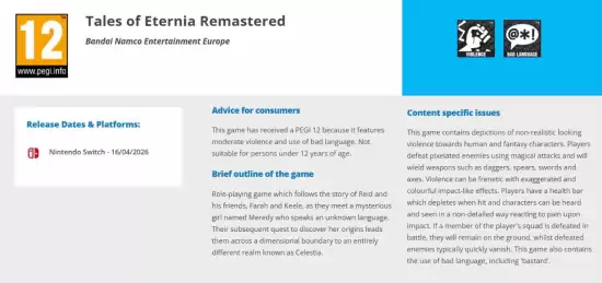 一则来自欧洲PEGI分级机构的消息,让经典JRPG《永恒传说》重制版的动向再次成为焦点。根据知名爆料人Wario64的发现,万代南梦宫旗下的这款作品已获得评级,而信息页面上标注的平台,仅有任天堂Switch。