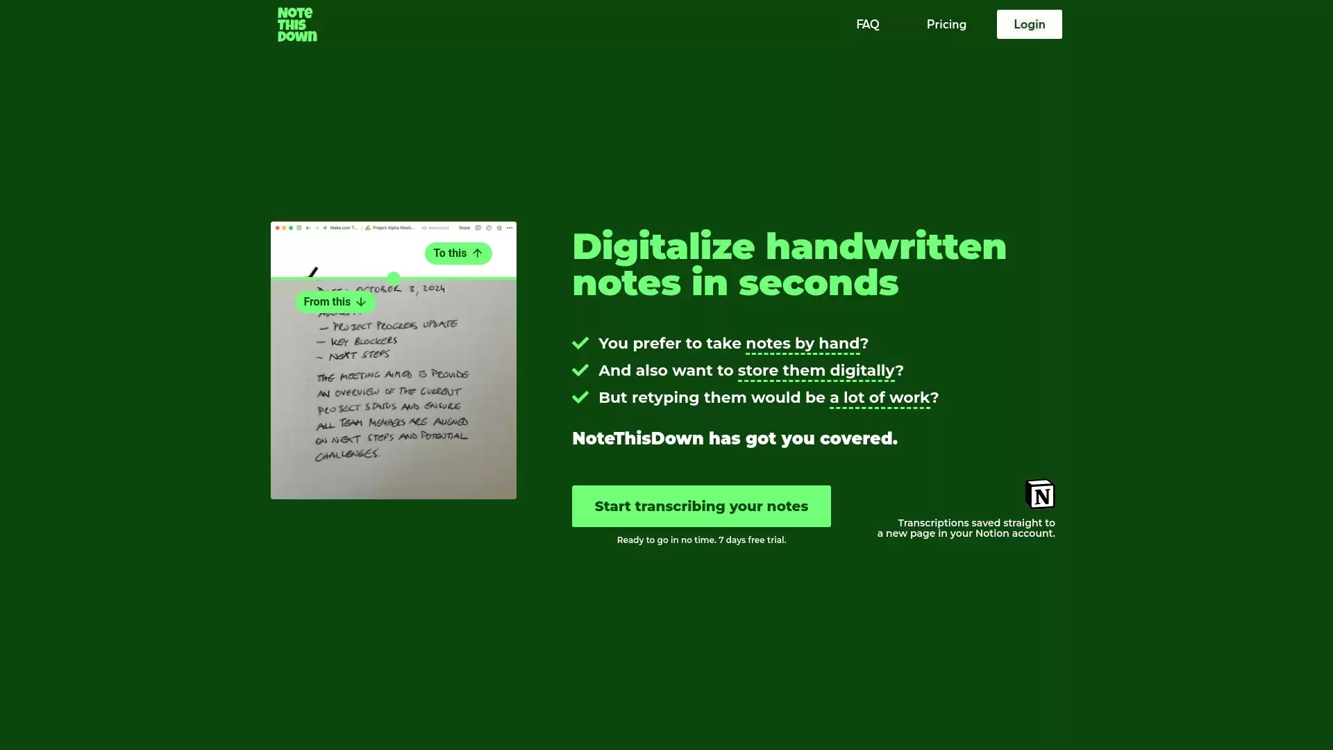 简单来说,NoteThisDown 是一款能将手写笔记“一键”转化为数字文本的工具,并且与 Notion 无缝集成。它的工作流程极为直观:你只需要对着手写笔记拍张照片,剩下的事交给它的 AI 处理。很快,那些纸上的字迹就会变成可搜索、可编辑的数字文本。这无疑是为那些钟爱手写质感,却又离不开数字化效率的朋友量身打造的。核心优势很明确:即时的手写识别转换、与 Notion 的直接深度集成,以及不设上限的上传和转录次数。