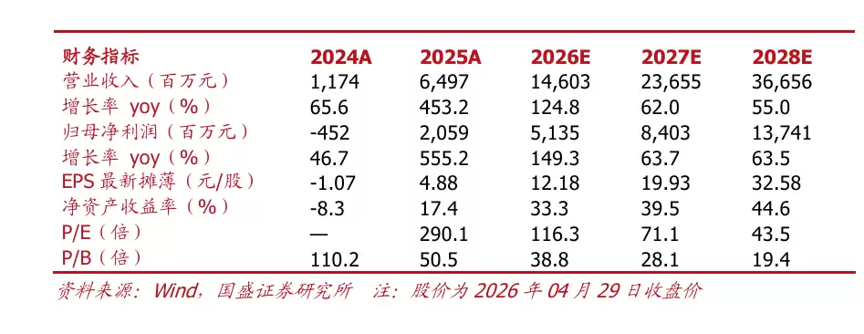 国盛证券同样维持“买入”评级,预计2026至2028年归母净利润分别为51.35亿元、84.03亿元和137.41亿元,对应EPS分别为12.18元、19.93元和32.58元/股,营收预测分别为146.03亿元、236.55亿元和366.56亿元。