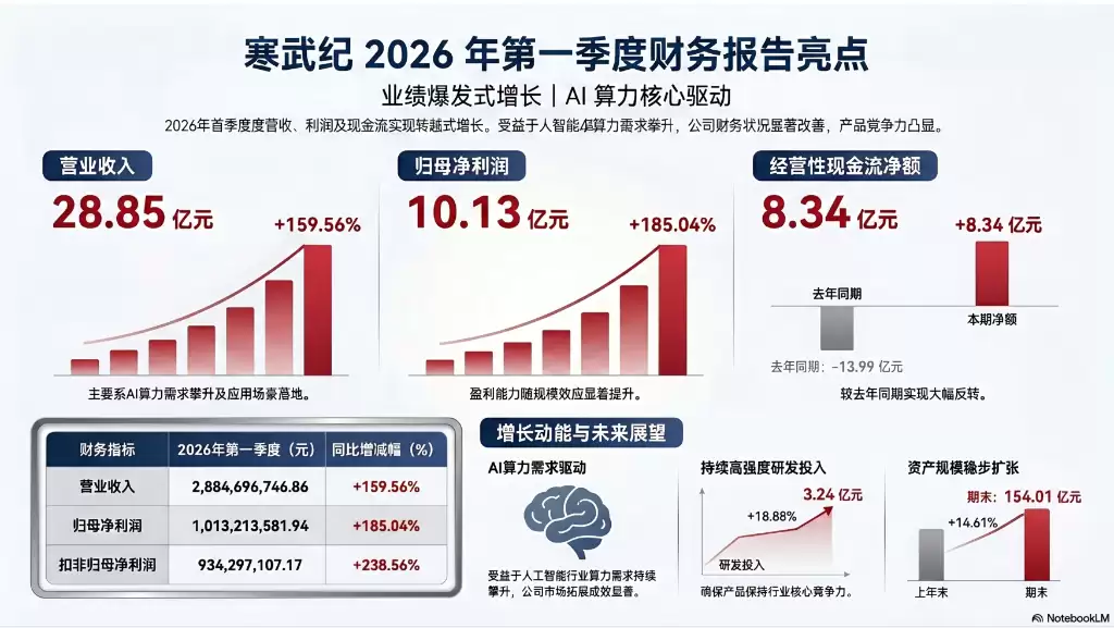 寒武纪2026年Q1业绩解读:AI算力需求持续攀升,驱动业绩强劲增长 4月29日,寒武纪(688256 SH)发布了2026年第一季度财报。数据显示,公司本季度实现营业收入28 85亿元,同比大幅增长159 56%;归属于上市公司股东的净利润达到10 13亿元,同比增长185 04%。 业绩为何能实