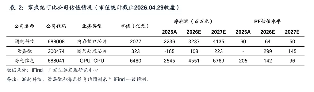 研发投入亦在同步加大。26Q1研发费用同比增长18.68%,研发团队仍在稳步扩张。硬件层面,公司新一代智能处理器微架构和指令集正在研发中,重点优化自然语言处理大模型、视频图像生成大模型及垂直类大模型的训练推理场景;软件层面,公司持续推进主流大模型体系的适配与优化,提升整体吞吐与资源利用效率。广发证券预期,公司下一代AI芯片产品性能有较大提升,软件生态更加完善,有望为2026至2027年贡献可观营收。