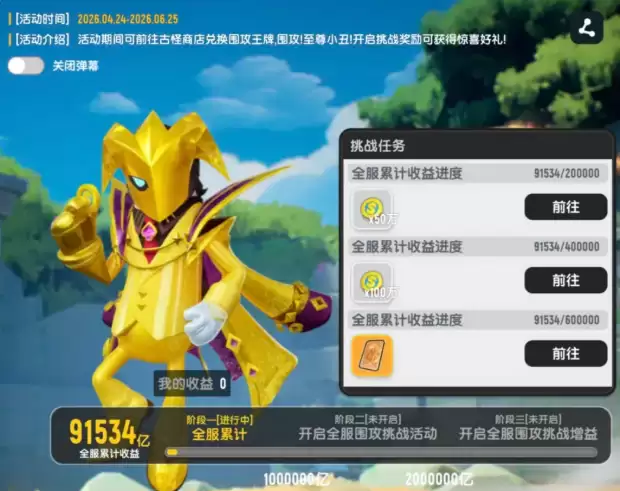 咱们先来拆解第一阶段该怎么玩。从4月24日到6月25日,玩家参与“摸金派对”所获得的收益,将会计入全服总进度。一旦全服收益累积达到指定目标,挑战至尊小丑的资格便会解锁。在推进进度条的过程中,达到某些关键节点,还能顺手领取肠宝币和至关重要的“围攻王牌”。这个“围攻王牌”是入场券——没错,只有拿到它,你才有资格进入最终的BOSS战。如果进度积累期间错过了,也别急,可以去古怪商店用其他资源兑换补票。