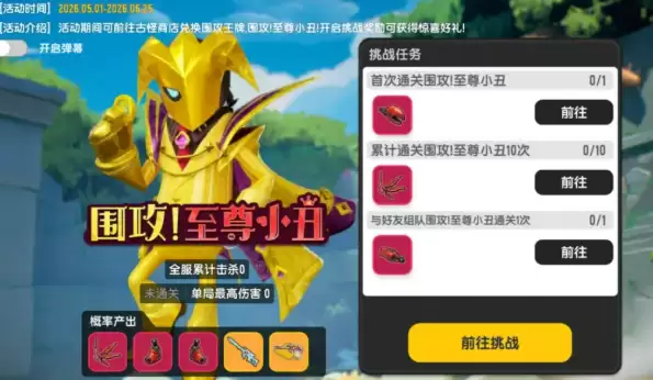 当全服进度成功达标,重头戏第二阶段就正式拉开了帷幕。这时,手握“围攻王牌”的玩家,便可以直面至尊小丑的挑战了。坦白说,这场BOSS战的难度不容小觑:至尊小丑攻击节奏快,伤害也相当可观。战斗的关键在于观察——紧盯他的攻击前摇动作,并及时闪避。切记不要站在原地硬扛,必须灵活走位,在移动中寻找安全的输出窗口。由于BOSS血量很厚,这场战斗很可能是一场持久战,需要多轮拉扯才能将其击败。