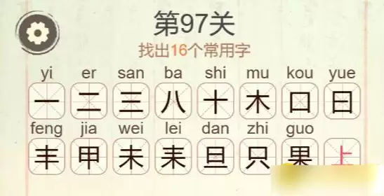 在《聪明开局吧》的第97关,挑战是要求玩家从“果”这个字里,找出16个常用汉字。最终的答案集合是:一、二、三、八、十、木、囗、曰、丰、甲、未、耒、旦、只、果、上。通关的关键,在于按照笔画和结构,有条不紊地逐一拆解识别。