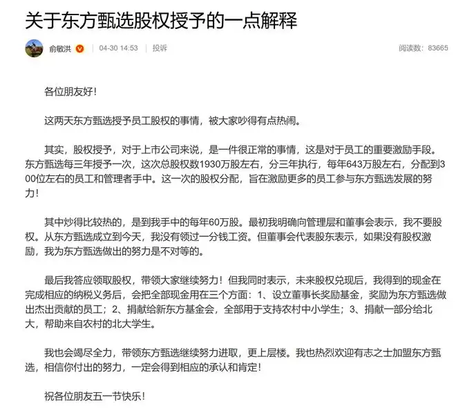 俞敏洪回应东方甄选股权激励:个人所获将全部用于奖励与捐赠 4月30日,新东方创始人俞敏洪通过个人微博,就近期备受关注的东方甄选股权激励事项作出了详细说明。核心信息很明确:他个人所获得的激励股份,未来兑现后,资金将全部用于设立员工奖励基金及公益捐赠,一分不留。 股权激励是常规操作,旨在凝聚团队 在回应