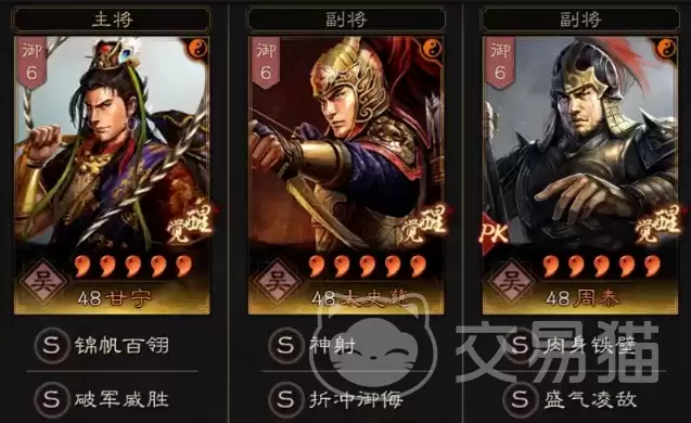 首先登场的,是堪称经典的“二保一”体系:甘宁、太史慈加周泰。这套阵容的逻辑非常清晰,就是让甘宁心无旁骛地打输出,太史慈和周泰则为他扫清障碍、保驾护航。具体怎么操作呢?甘宁这边,破军威胜和横扫千军是黄金搭档,一个负责破防,一个负责打出成吨的群体伤害;兵书选择胜而益强、胜战和执锐,属性点全堆武力,追求极致的爆发。